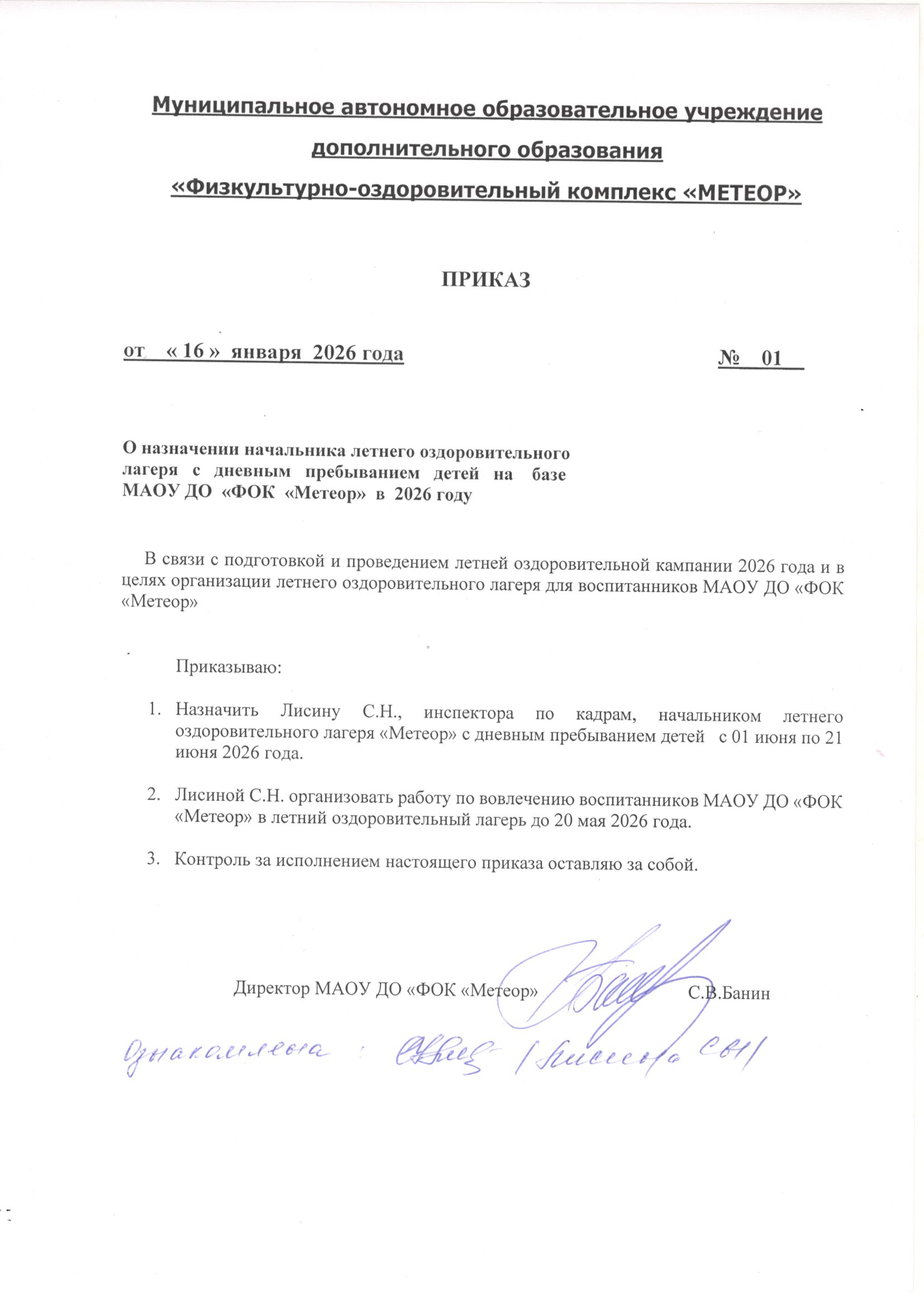 Приказ о назначении начальника лагеря 2026г.